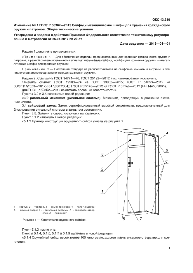| Область применения: | Настоящий стандарт распространяется на сейфы и металлические шкафы для хранения гражданского оружия и патронов75. Стандарт устанавливает требования к конструкции оружейных сейфов, обеспечивающих надежное хранение гражданского оружия и патронов, и безопасность эксплуатации |