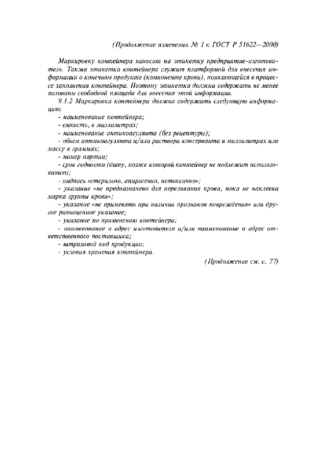 | Область применения: | Настоящий стандарт распространяется на полимерные контейнеры для крови и ее компонентов, стерильные, однократного применения, предназначенные для взятия крови, разделения ее на компоненты, хранения, транспортирования и переливания крови и ее компонентов. Стандарт устанавливает технические требования, включая эксплуатационные характеристики и методы испытаний при приемосдаточных, сертификационных и периодических испытаниях |