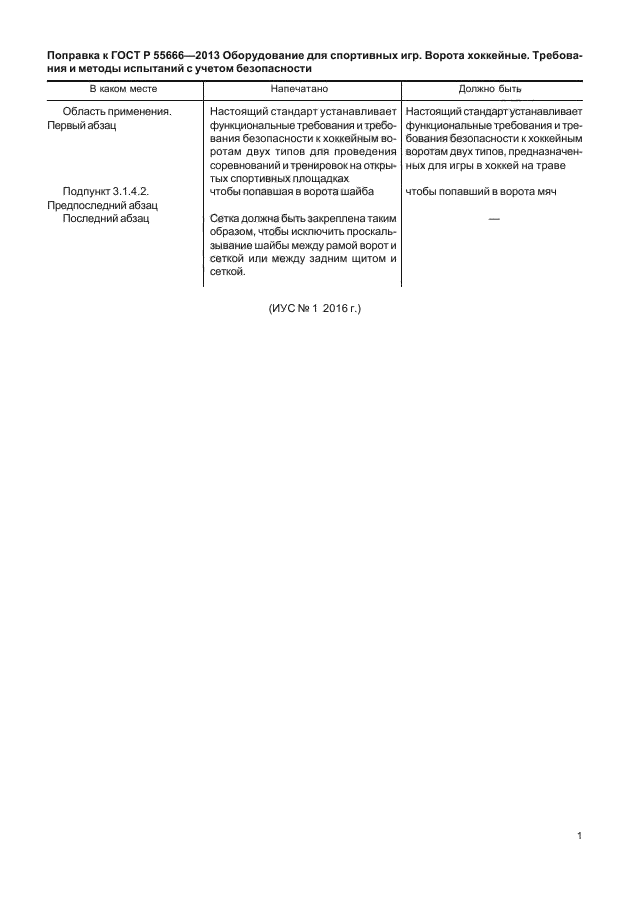 | Область применения: | Настоящий стандарт распространяется на оборудование для спортивных игр. Стандарт устанавливает функциональные требования и требования безопасности к хоккейным воротам двух типов для проведения соревнований и тренировок на открытых спортивных площадках |