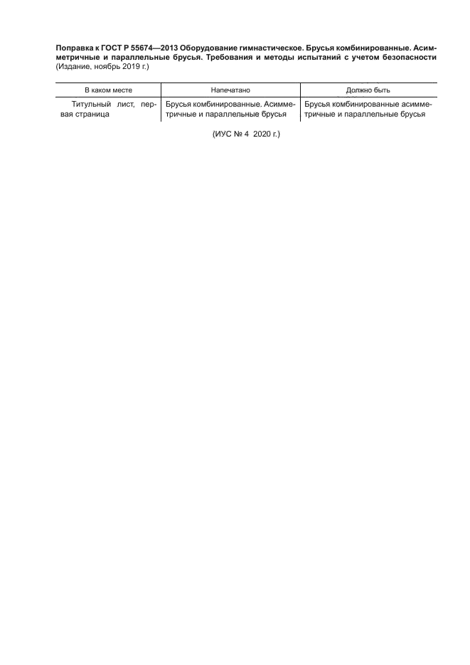 | Название рус.: | Оборудование гимнастическое. Брусья комбинированные асимметричные и параллельные брусья. Требования и методы испытаний с учетом безопасности |